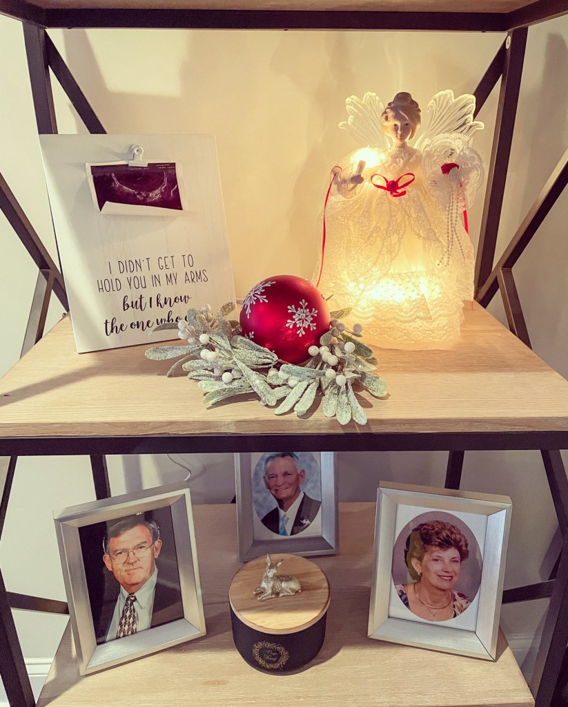 But God. God has a way of always making sure you are taken care of. He places people in your life that He knows you will need. I had three friends show up at my house on November 18th with pizza in hand and a heart of gold. At the end of that night, my tree was decorated, my house was decorated, and glitter was everywhere. There was one spot, that I will post a picture of below, that remains decorated the same way all year. Beside a picture of my baby, she had placed an angel. It was my grandmother’s angel that she used to put out every year before she passed away.